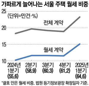 서울 주택의 ‘월세화’는 빠른 속도로 진행 중이다. 서울 주택의 월세 계약 비중은 지난해 2분기 58.9%에서 3분기에 60.3%, 4분기에 61.2%로 증가세를 보인 뒤 올해 1분기에 65%에 육박하는 수준으로 비중이 커졌다. 2021년까지만 해도 연평균 40%대 수준이던 월세 비중은 역전세난과 전세사기가 사회문제로 떠오른 2022년과 2023년에 50%대로 높아졌고 지난해는 평균 60%를 넘겼다.