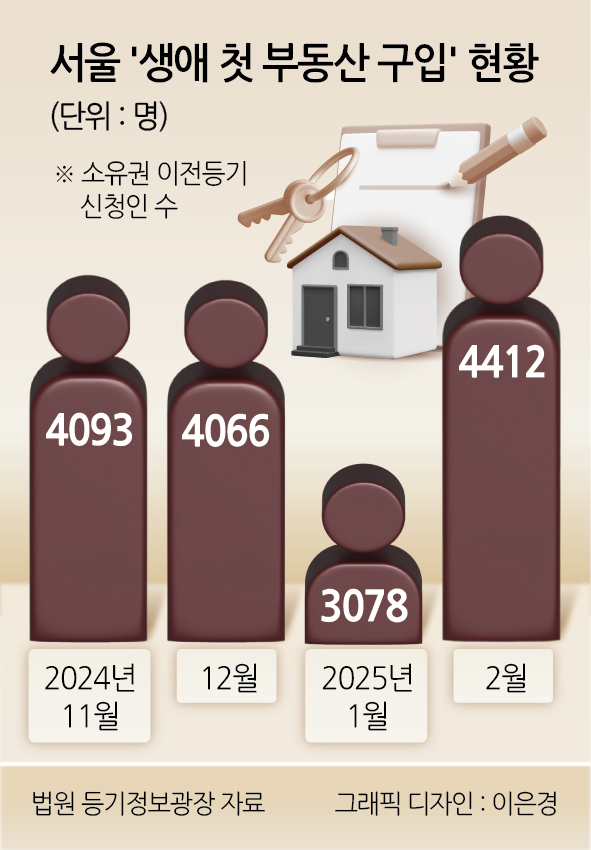 3일 법원 등기정보광장 소유권이전등기(매매) 현황에 따르면 지난 2월 서울에서 생애 첫 부동산을 매입한 수는 4412명으로 집계됐다. 지난해 10월 이후 최대치로, 한 달 전(3078명)보다 43% 급증했다.