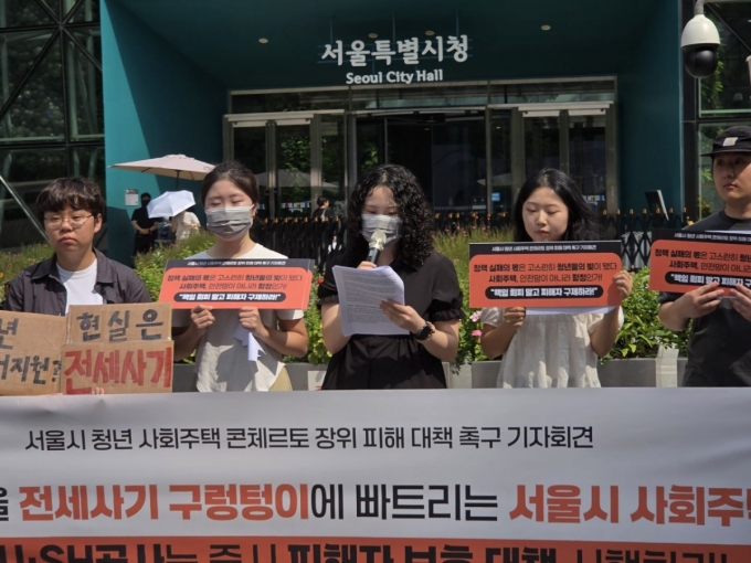 이달 21일 서울시청 앞에서 '토지임대부 사회주택 콘체르토 장위 전세사기 비상대책위원회'는 기자회견을 열고 서울시와 서울주택도시개발공사(SH)에 사회주택 피해 해결방안을 촉구했다。