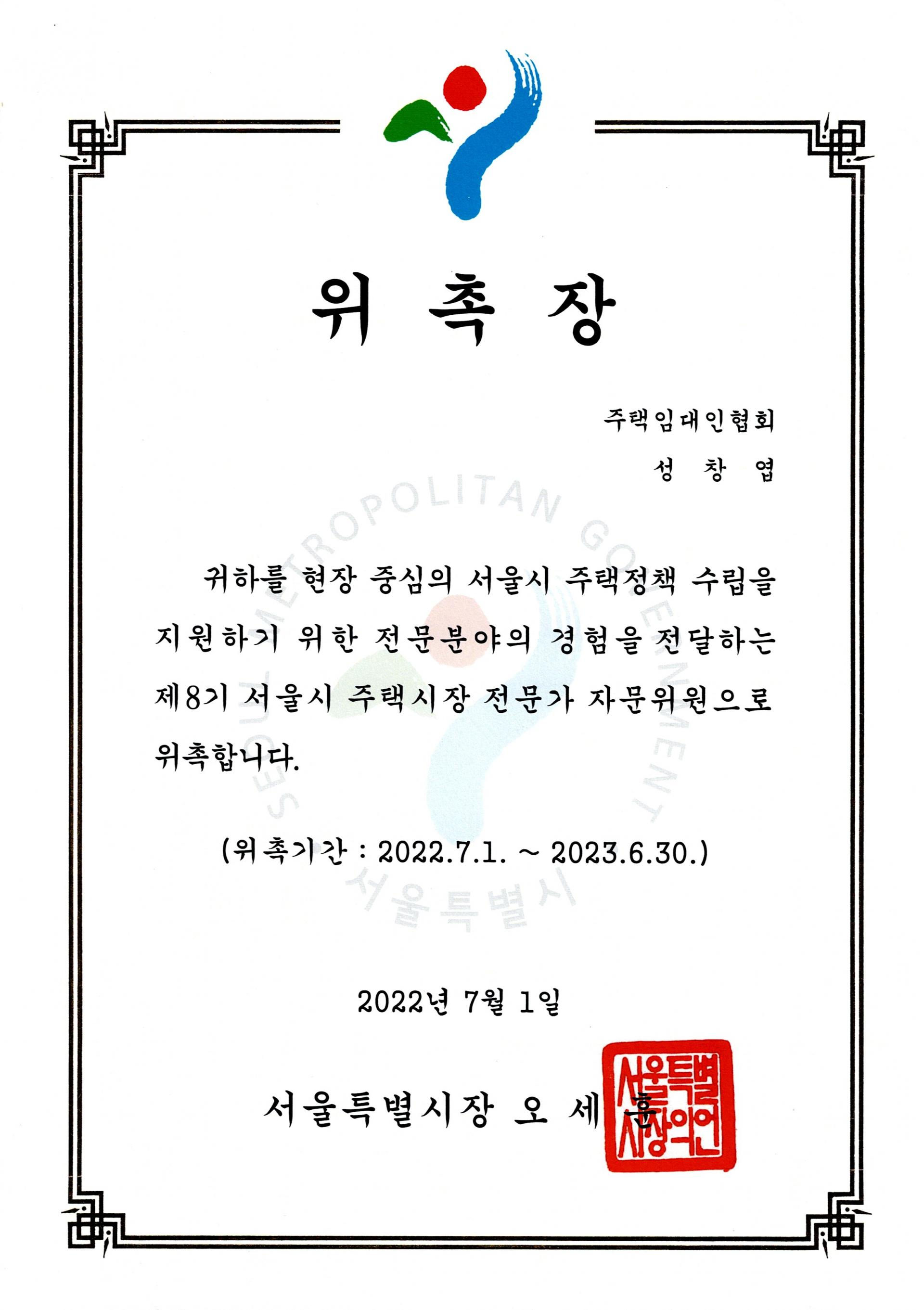 대한주택임대인협회는 2022년 7월 1일 대한민국 부동산 시장의 중심인 서울시의 주택정책 수립의 과정에서 현장의 다양한 의견을 전달하도록 제8기 서울시 주택시장 전문가 자문위원으로 위촉받았습니다.
